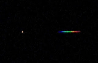 I started on Canopus, after the bright star align was completed, but was more interested in Betelgeuse. After slewing and removing the eyepiece and inserting my newly built contraption, I was sure it was the world's first ultra-low resolution Spectroscope. A quick google search showed I was in fact two years behind the times. However to my amazement I had colour and with some detail, I got "lines" as well. I messed around trying different settings and moved over to Betelgeuse and took some more and put the 2 x barlow in front of the Cannon 550D and tried that for comparison purposes. (See image - top of page)