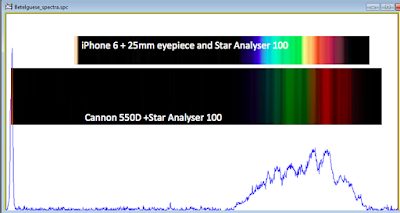 I have got them calibrated now. The iPhone6 version calibration is still a bit rough. Lining up on the Helium Lines seems to produce the best results. The camera response is markedly different for the iPhone over the Cannon 550D. Now that I know what we are looking at here, next time I image I can make sure I get the image in a bit better focus. I have also found a way to reduce camera shake by delaying the shutter open until 3 secs after you press the shutter button. Whilst you can see visually the same lines, when extracted using Visual Spec the camera response seems a bit different.